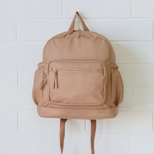 Mochila de lona con múltiples compartimentos y cierre dorado