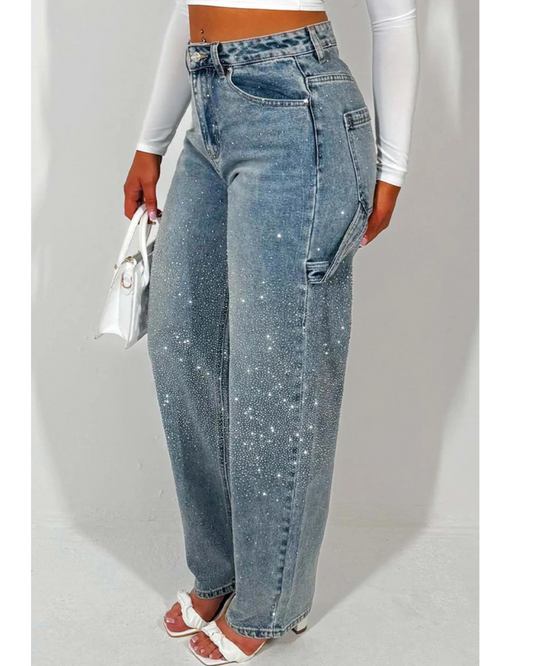 Pantalón Ancho con Detalles de Brillantes y Estilo Cargo