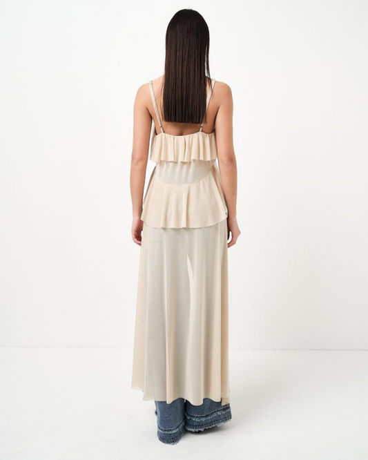 Blusa de Tul Elástico con Volantes en la Parte Inferior y Cola en la Espalda