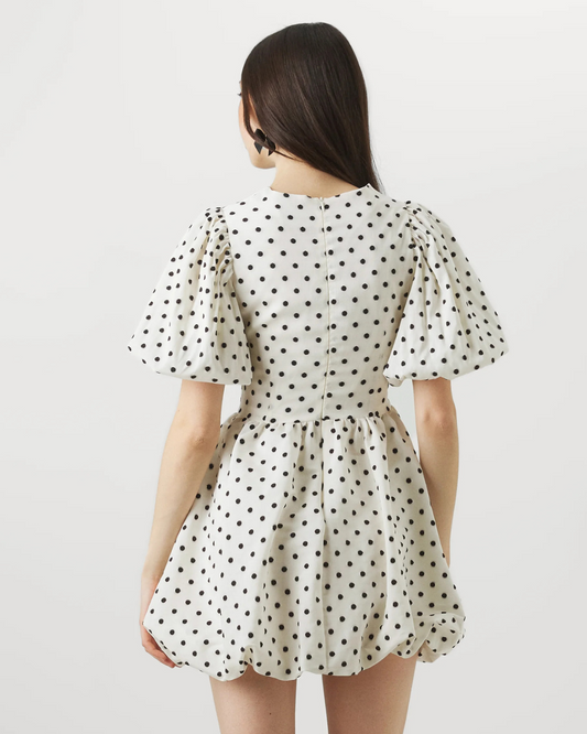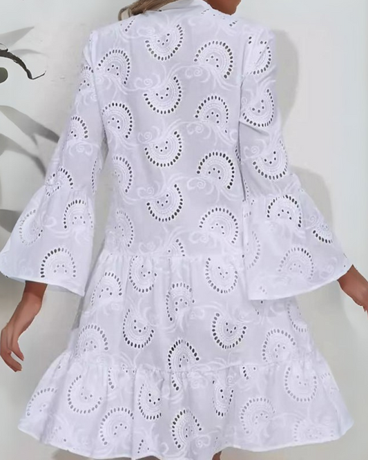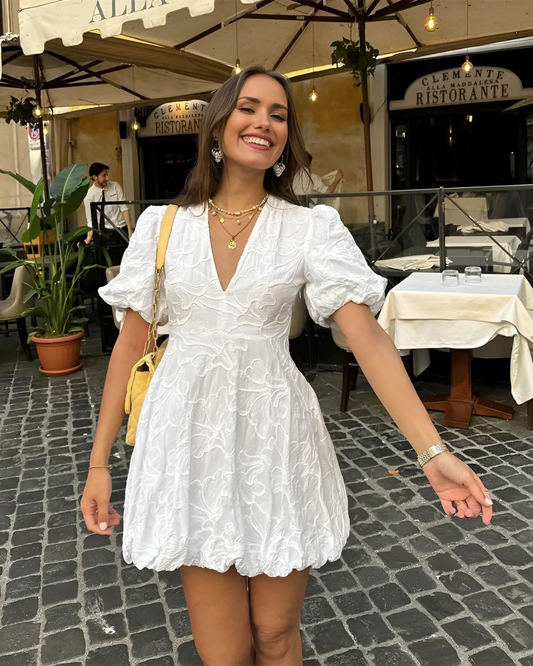 Vestido Corto Bordado con Manga Abullonada y Diseño Troquelado para un Look Ligero y Encantador