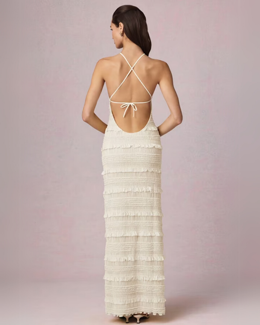 Vestido largo de volantes con cuello halter y espalda descubierta