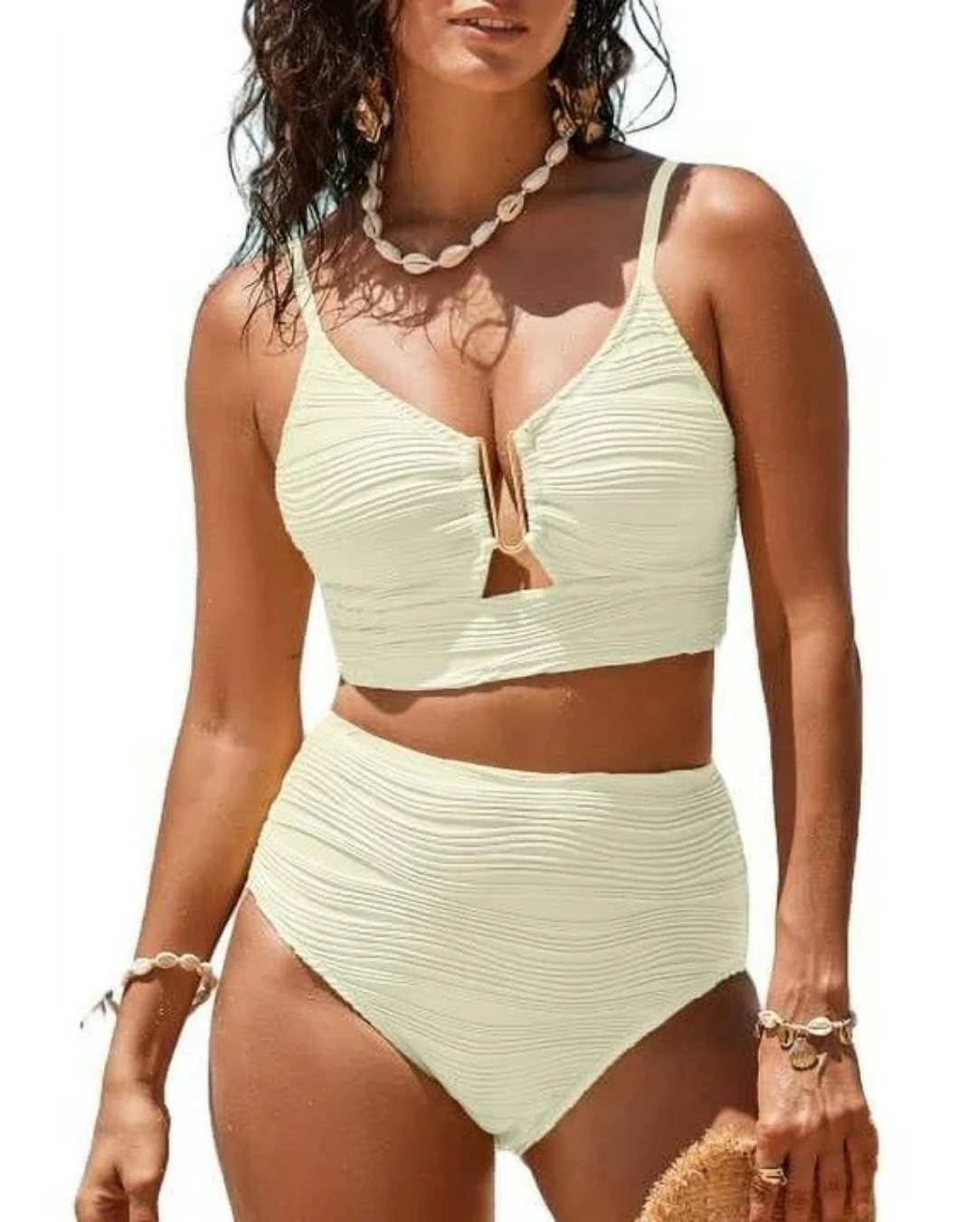 El diseño de corte alto con aros realza y define, mientras que el escote en U añade atractivo visual. El dorado metalizado eleva tu look de playa con un toque atrevido y lujoso.