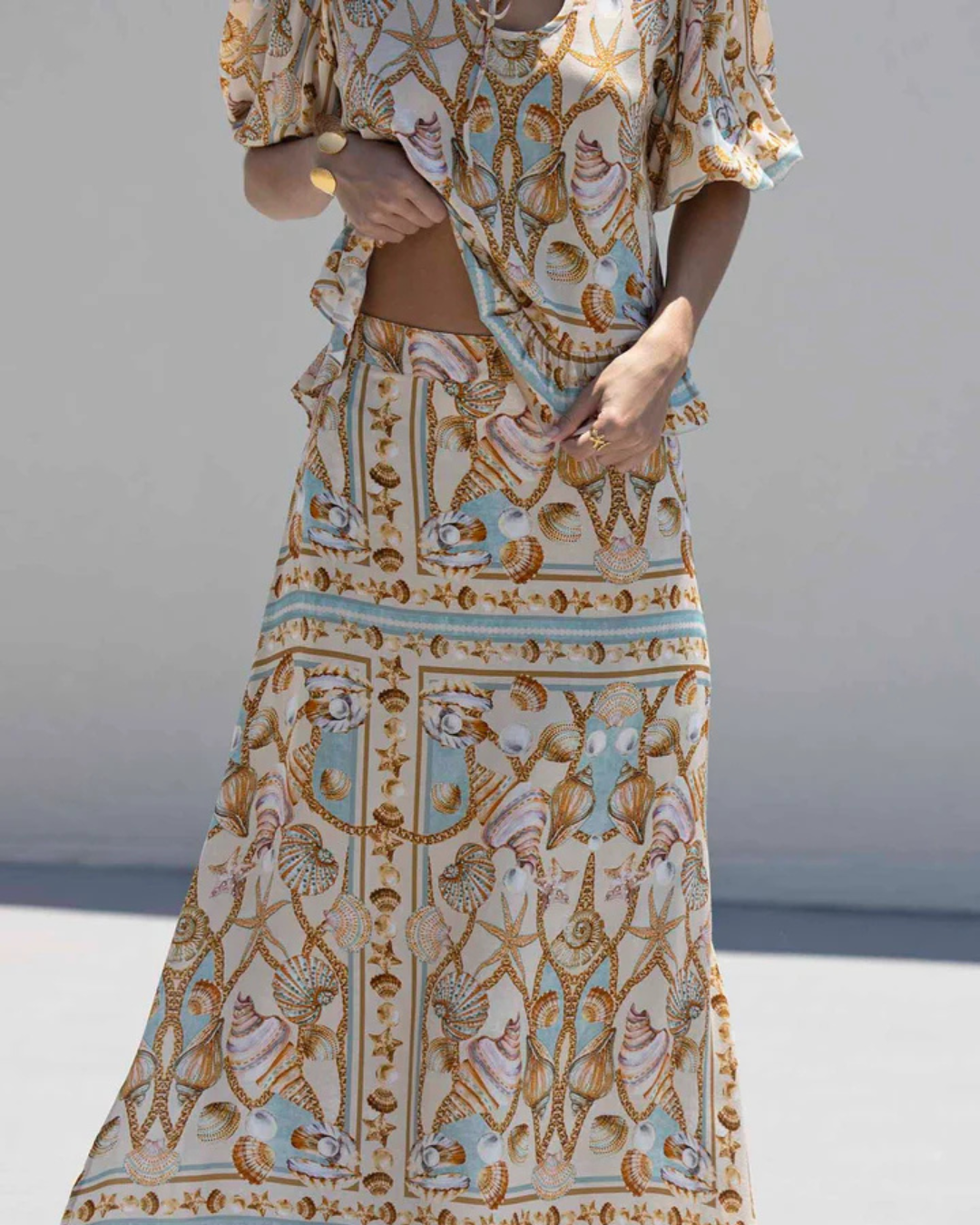 Déjate envolver por el encanto de los estampados oceánicos con este conjunto ligero y vaporoso. La blusa con mangas abullonadas y lazos delanteros aporta un sofisticado toque boho, perfecto para los días soleados o las citas informales con estilo. Cómodo, fresco y lleno de personalidad.