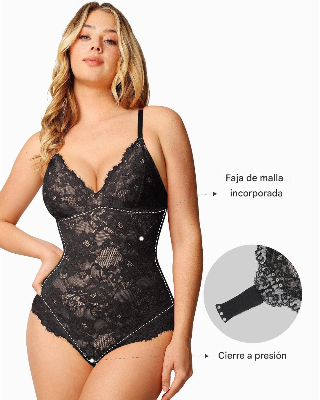 Diseñado para resaltar tu feminidad con confianza, este body de encaje abraza tus curvas con una textura delicada y acabados románticos. Ideal para ocasiones especiales o para sentirte increíble cada día.