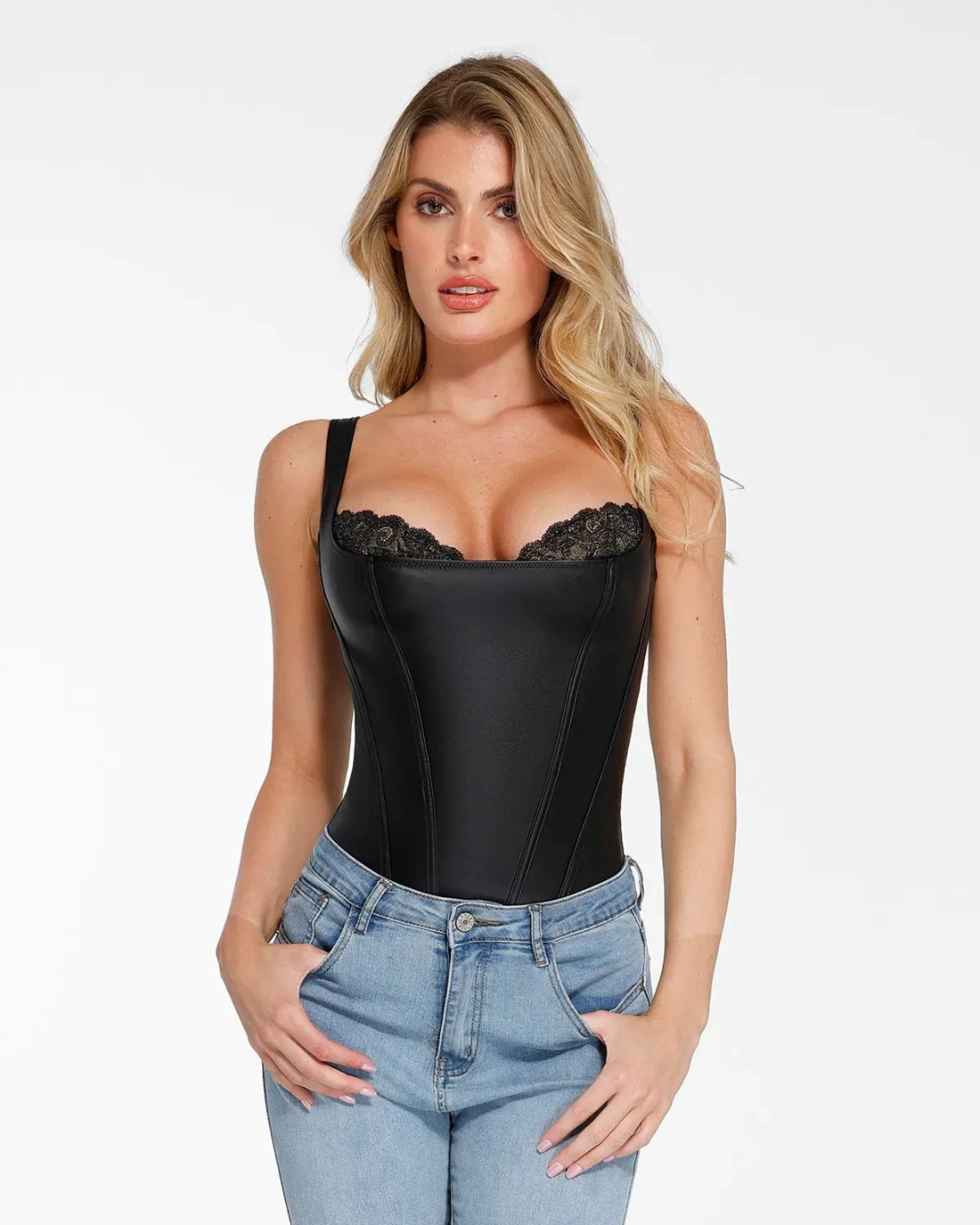 Este body combina la delicadeza del encaje con el efecto sofisticado de la piel sintética para un look atrevido y sensual. Su diseño entallado realza con elegancia tus curvas.