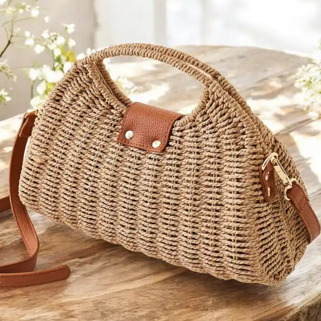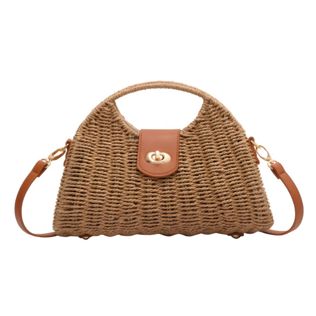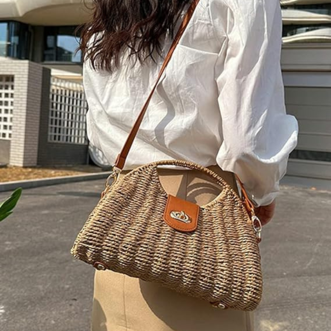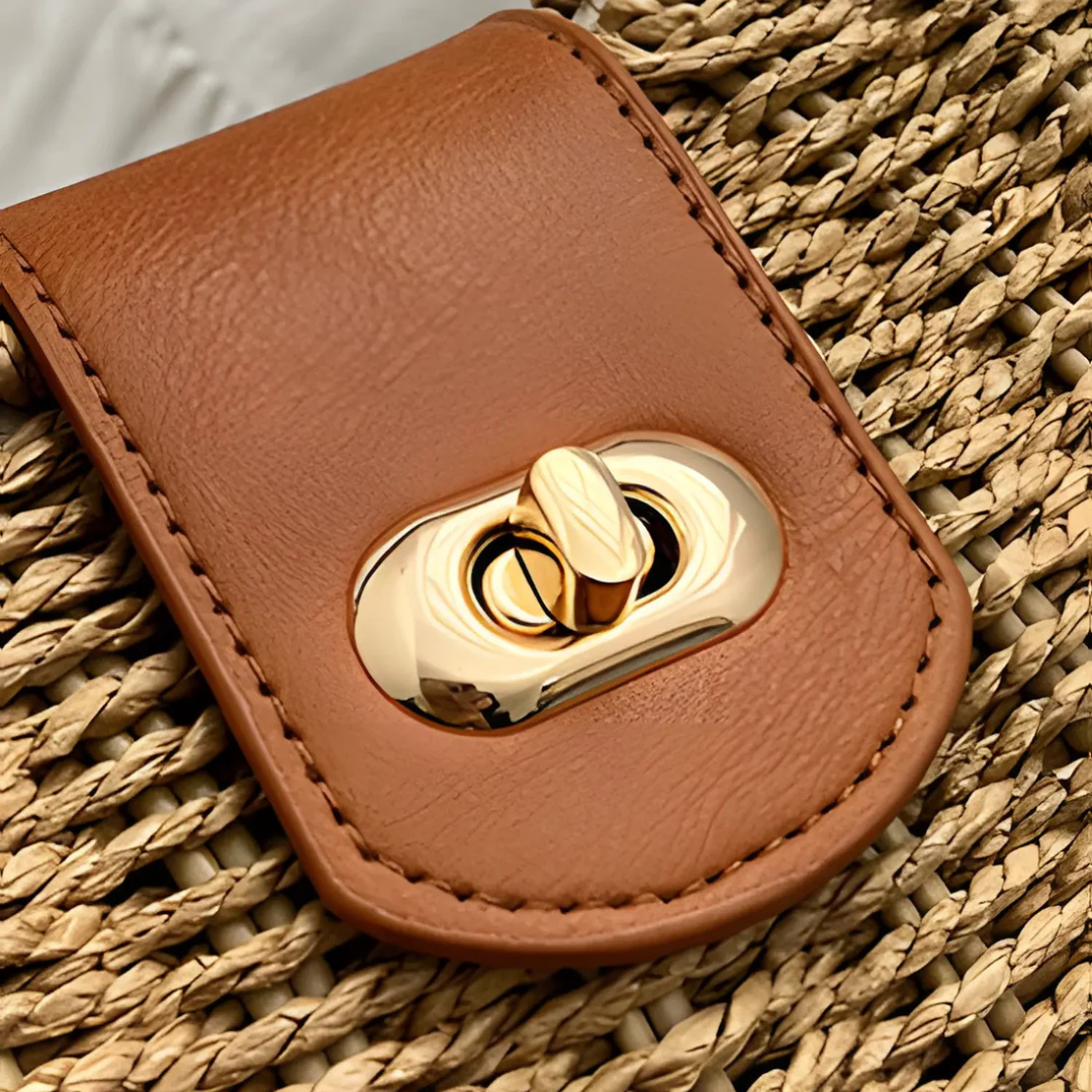 El equilibrio perfecto entre lo rústico y lo refinado. Este bolso combina textura orgánica con un broche dorado que aporta carácter y distinción. Ideal para looks veraniegos o urbanos con personalidad.