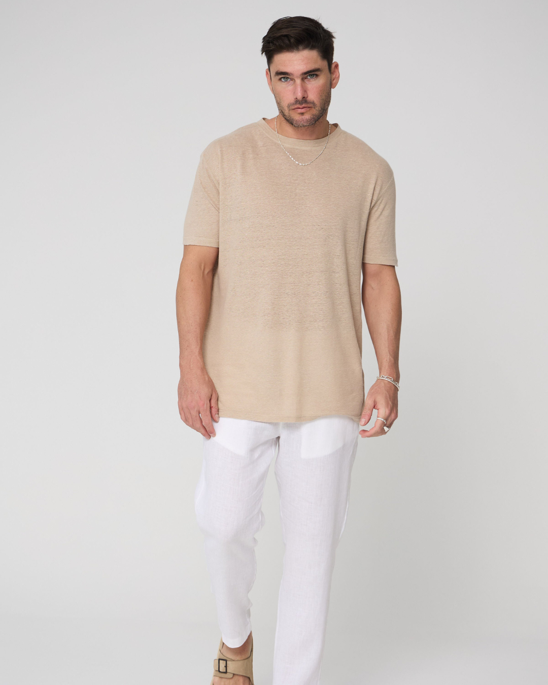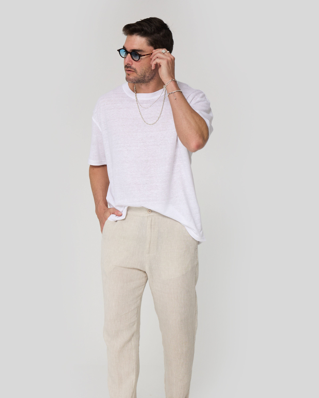 El lino aporta una textura natural que permite una óptima ventilación, manteniendo el cuerpo seco y fresco incluso en climas cálidos.