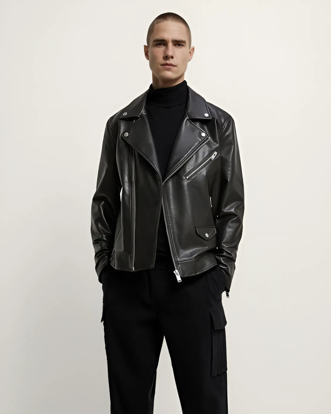 Chaqueta Clásica de Cuero con Solapa para Hombres