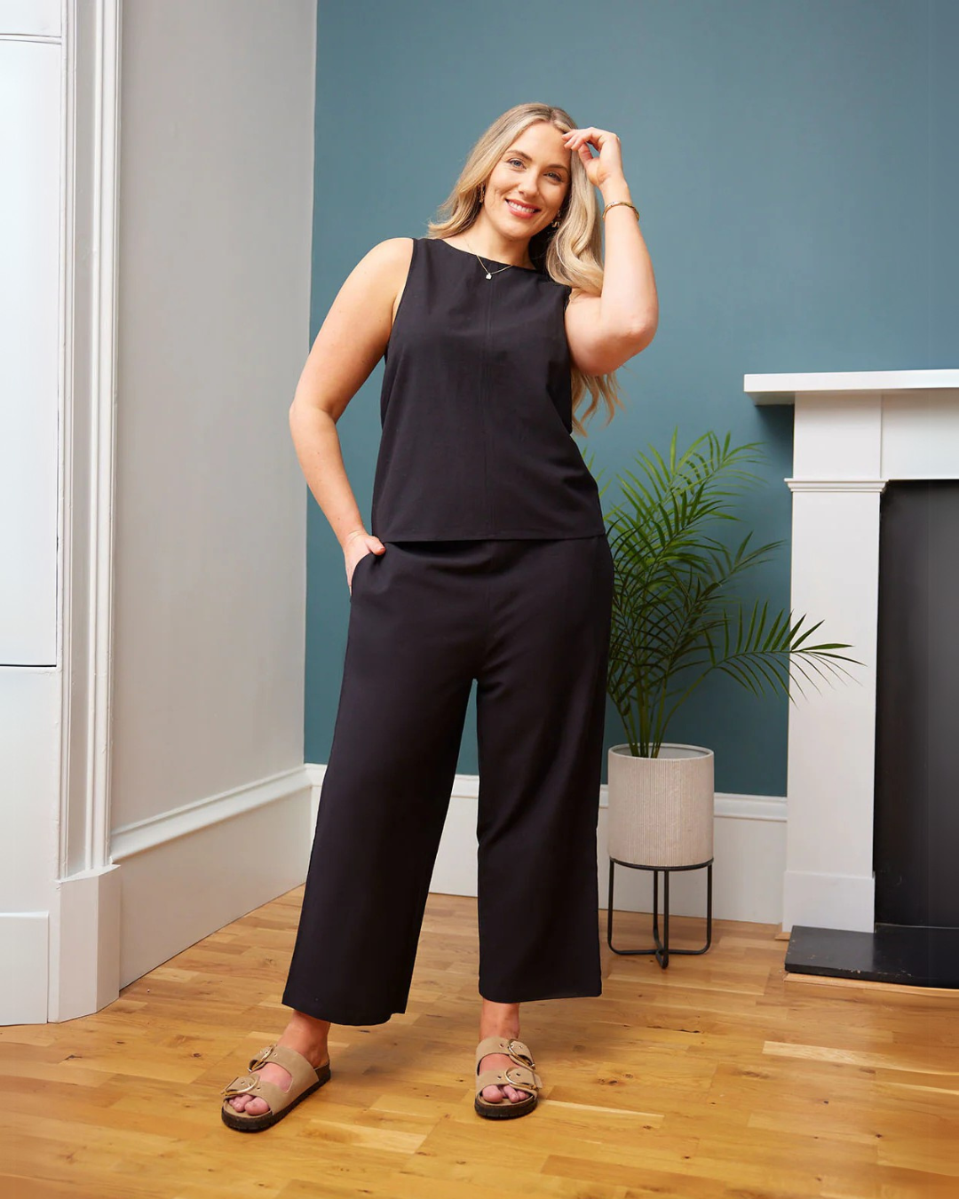 Este conjunto de dos piezas combina la sencillez del diseño minimalista con la sofisticación del color negro, creando un look pulido sin complicaciones.