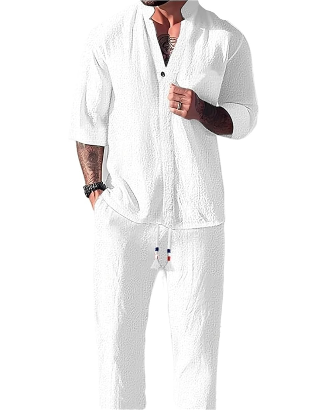 Este conjunto de dos piezas combina la ligereza del lino con la suavidad del algodón.