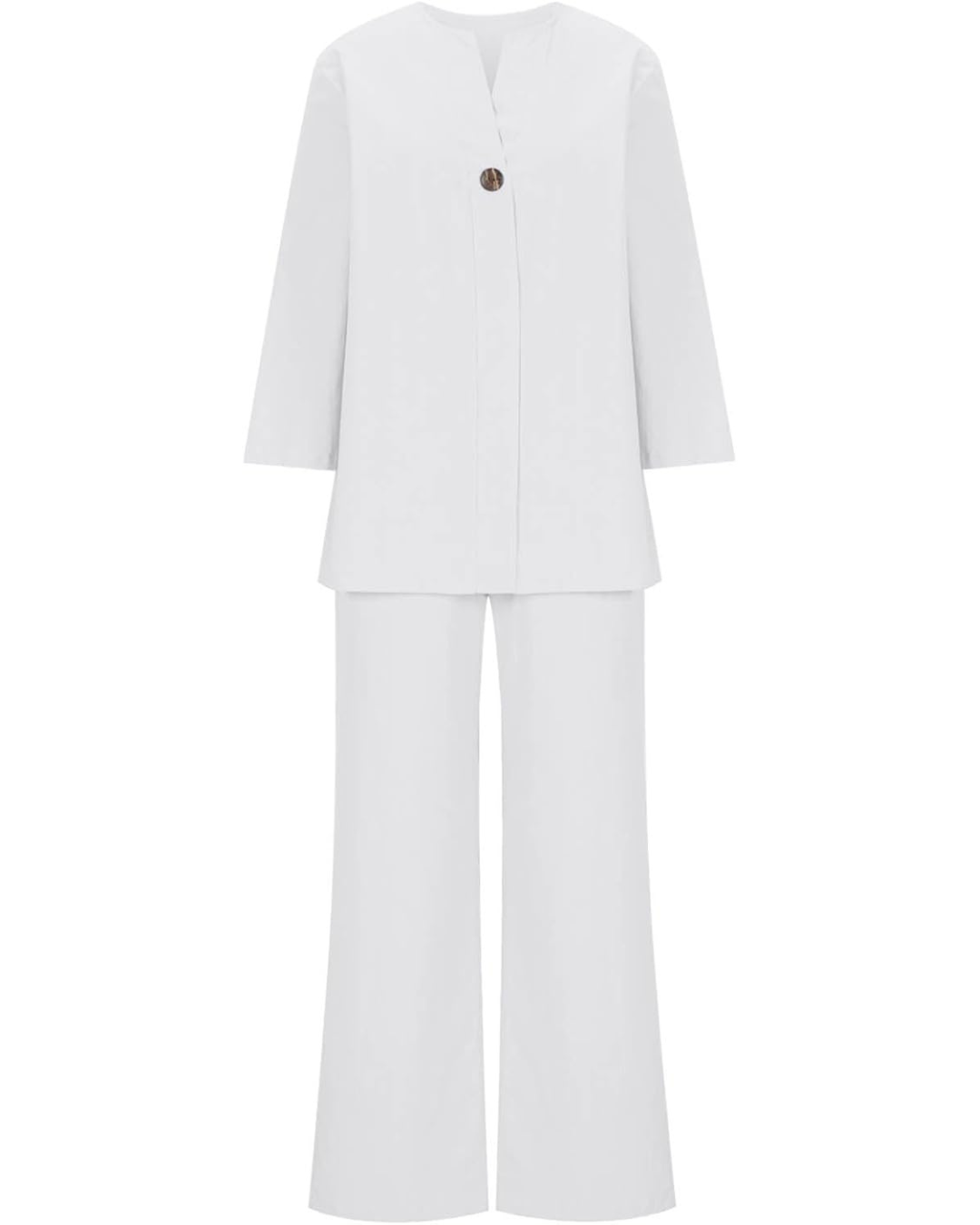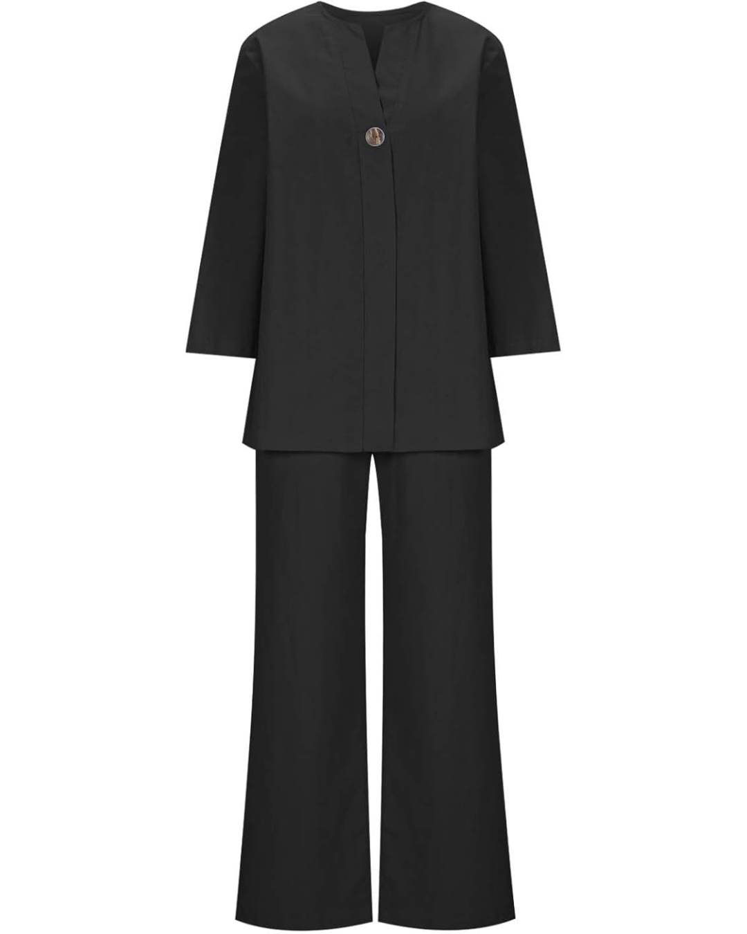 Conjunto Informal de Dos Piezas de Algodón y Lino Decorado con Botones para Mujer