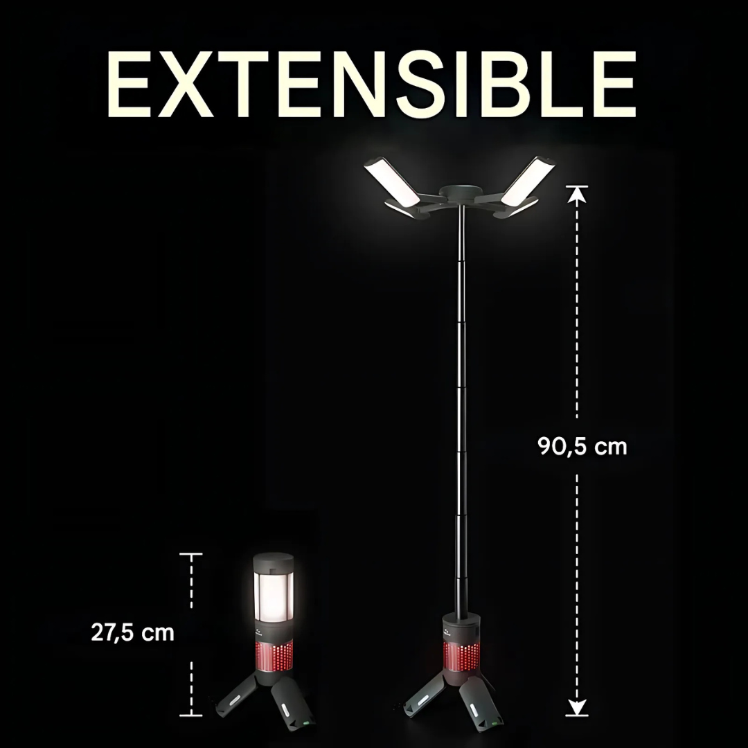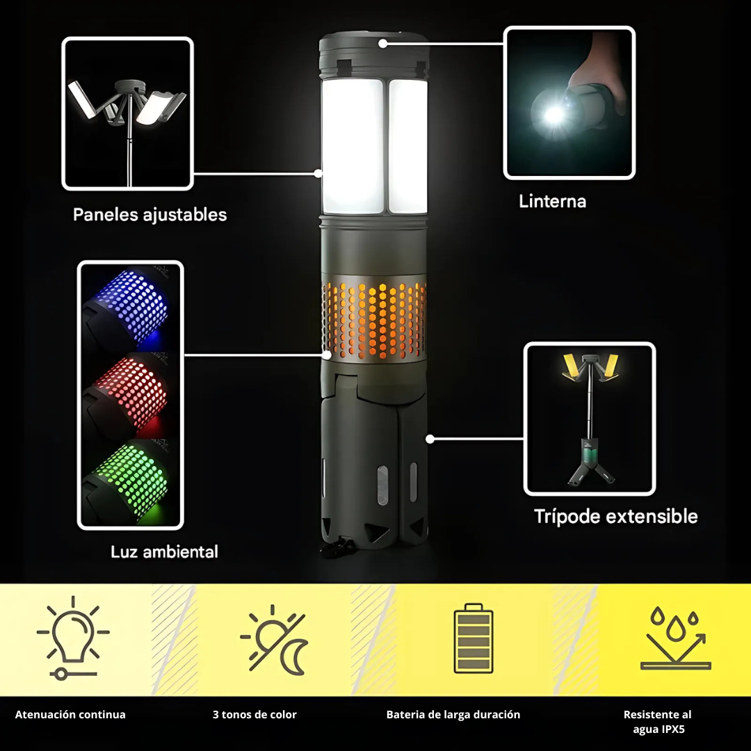 Descubre la versatilidad hecha luz. Nuestra lámpara innovadora cuenta con paneles LED ajustables para iluminar áreas grandes, una linterna frontal para cuando necesitas un haz de luz directo y una función de luz ambiental con 3 tonos diferentes para crear la atmósfera deseada.