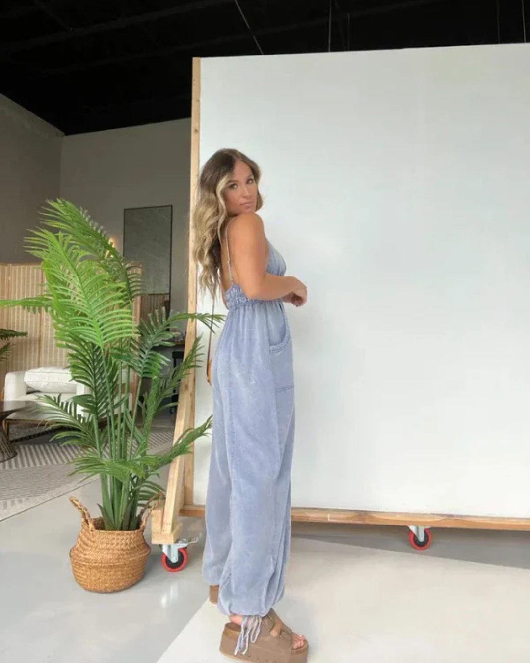 Mono largo de mezclilla con escote profundo y cintura fruncida