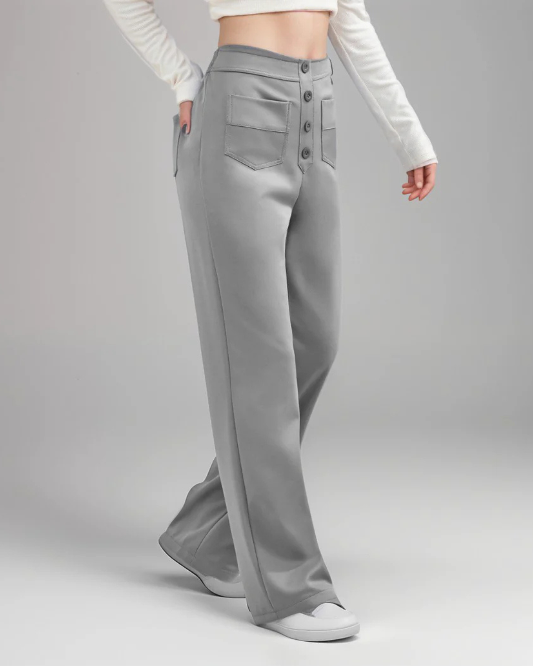 Pantalón Recto de Talle Alto con Botones Decorativos y Bolsillos Delanteros de Estilo Práctico