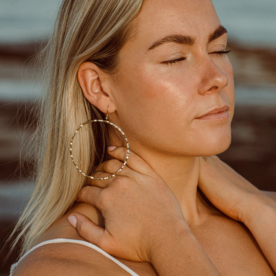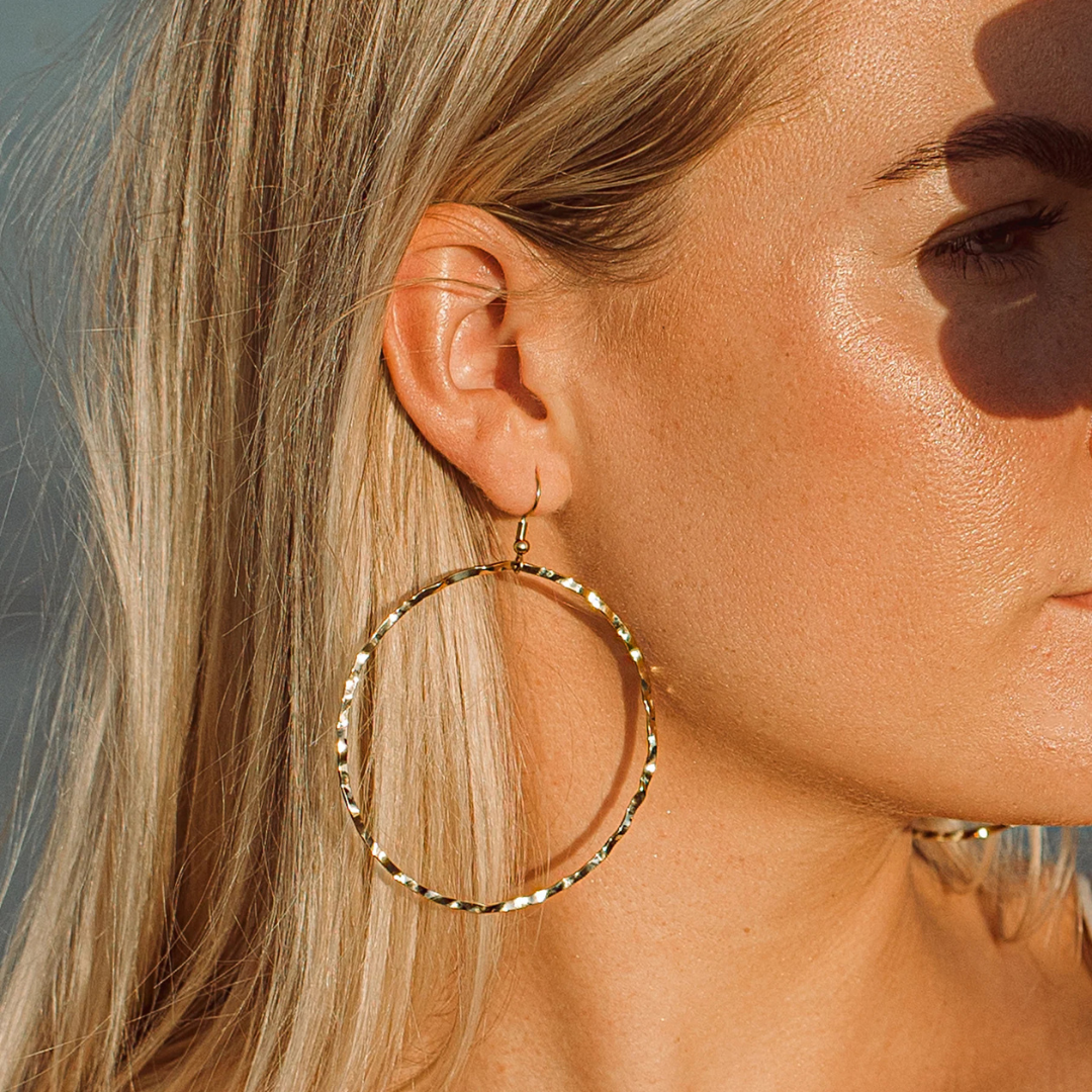 Estos aros de gran tamaño no solo son una pieza de joyería, sino una extensión de tu personalidad vibrante y libre. Cada pendiente ha sido cuidadosamente trabajado para lograr un efecto martillado distintivo que refleja la luz de manera única..
