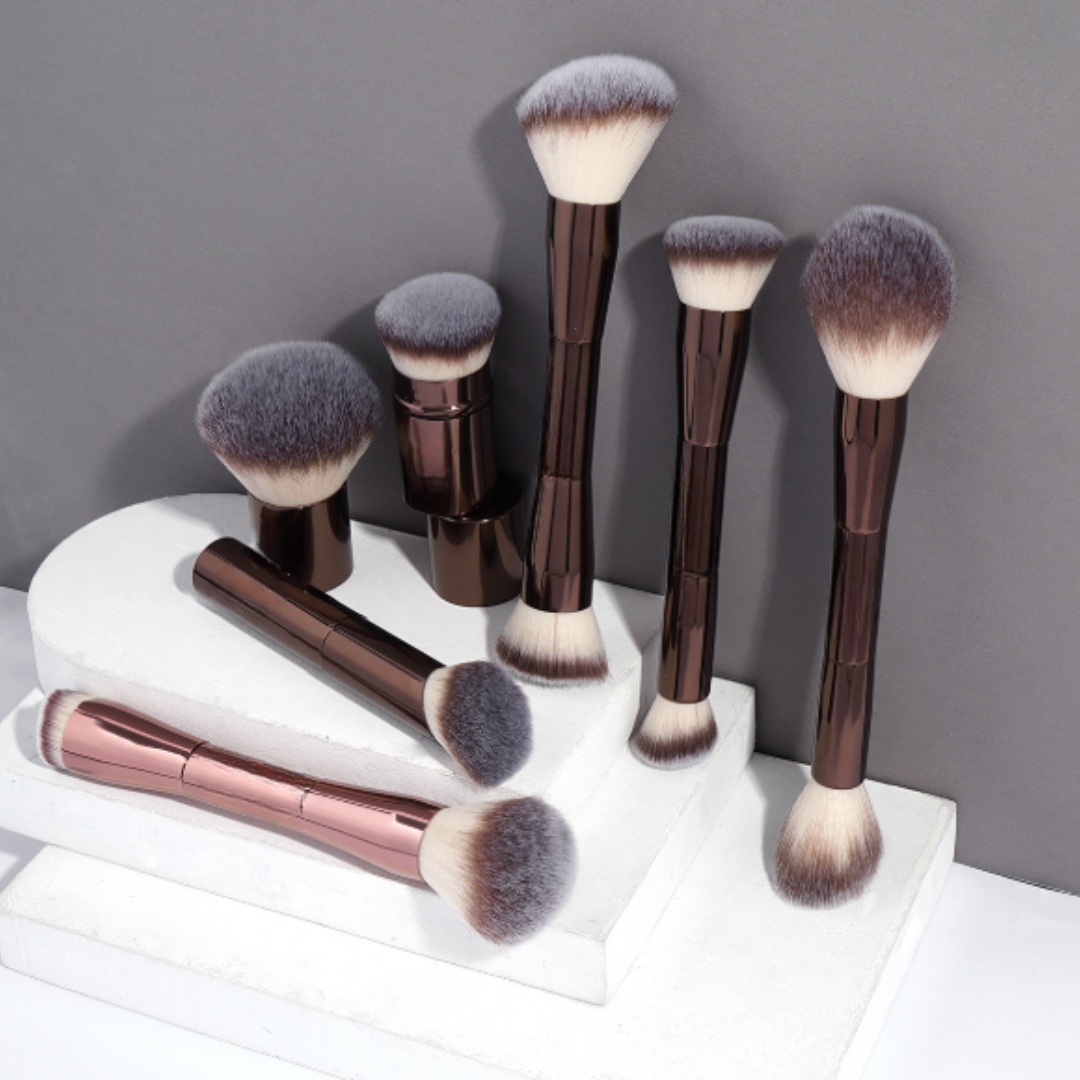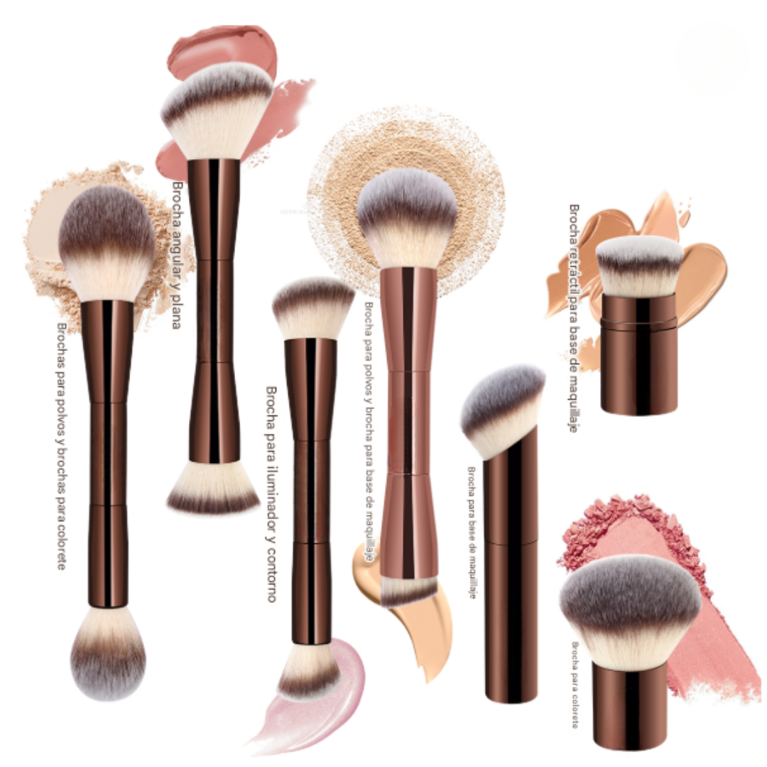 Este set de brochas de maquillaje dobles ofrece una experiencia de aplicación profesional desde la comodidad del hogar. Su diseño ergonómico con acabados metálicos en tonos oscuros y sofisticados no solo aporta elegancia, sino también facilidad de uso gracias a su estructura liviana y balanceada.