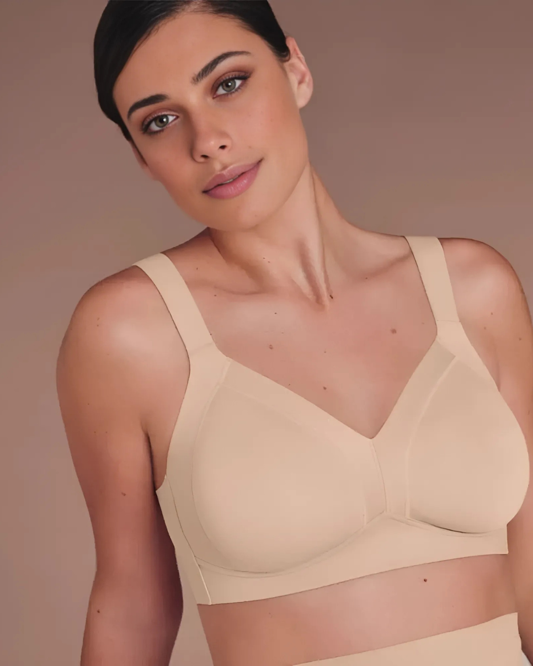 Este sujetador sin aros con tirantes anchos, no se enrollan ni se calan, repartiendo el peso del pecho, dejando descansar los hombros y las cervicales,  ideal para mujeres con rutinas intensas.