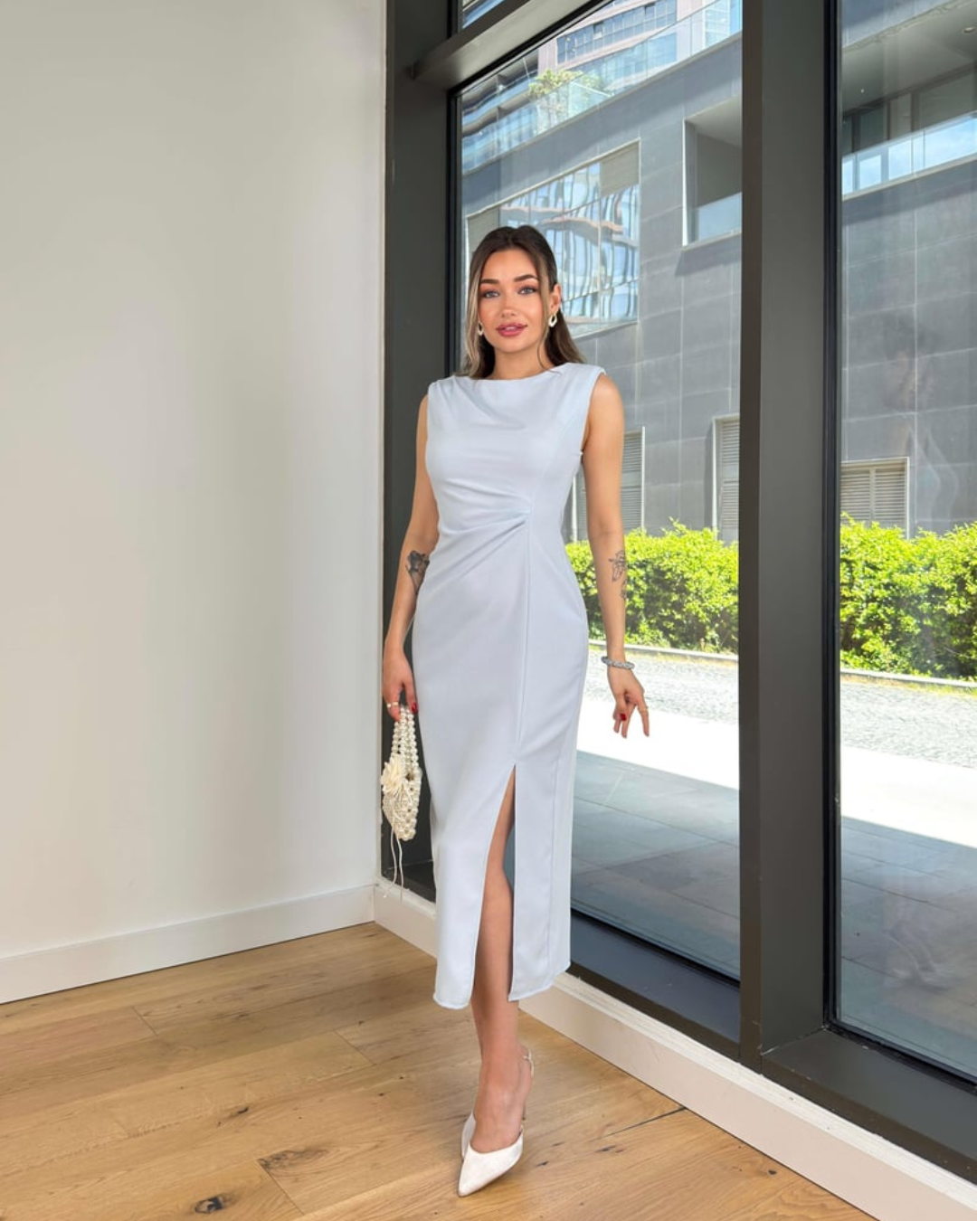 Descubre la sofisticación en este vestido ceñido que realza tu figura con gracia. Su diseño sin mangas y el detalle de la abertura en la pierna añaden un toque de sensualidad discreta, perfecto para eventos especiales o noches donde quieras deslumbrar con un estilo pulcro y contemporáneo.