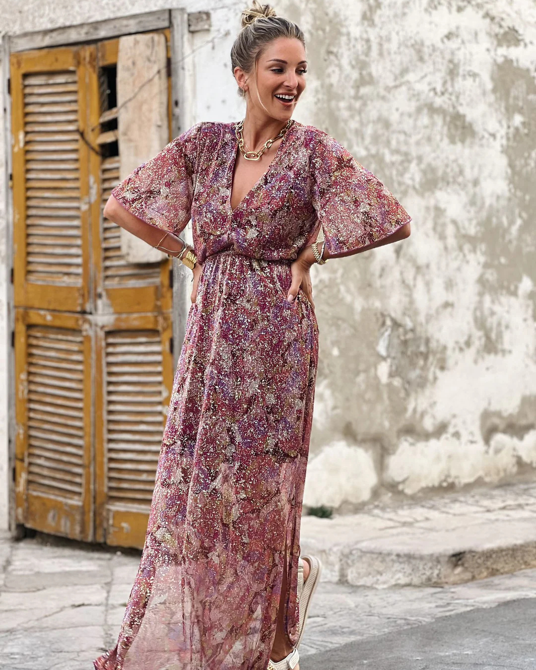 Descubre la comodidad y el encanto de este maxi vestido de corte vaporoso. Su escote en pico y sus mangas de volantes le confieren un aire etéreo, mientras que su cintura elástica y la apertura lateral garantizan una silueta cómoda y favorecedora en cada paso.